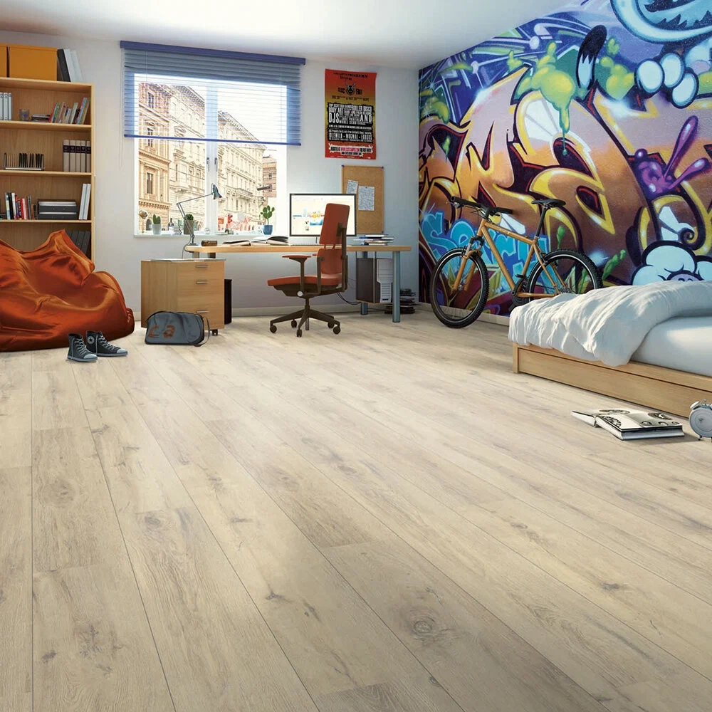 - Укладка: Начинайте укладку с угла комнаты, оставляя зазор 10-12 мм от стен для компенсации расширения ламината. Используйте клинья или распорные крестики для фиксации зазора.