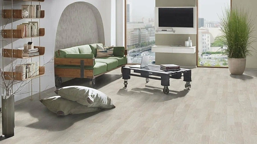 Ламинат Castello 8/32 «Дуб Рейкьявик» выполнен в светлом холодном оттенке дуба с мягкой древесной текстурой. Такой цвет визуально расширяет пространство и делает интерьер светлее — отлично подходит для современных, скандинавских и минималистичных интерьеров.